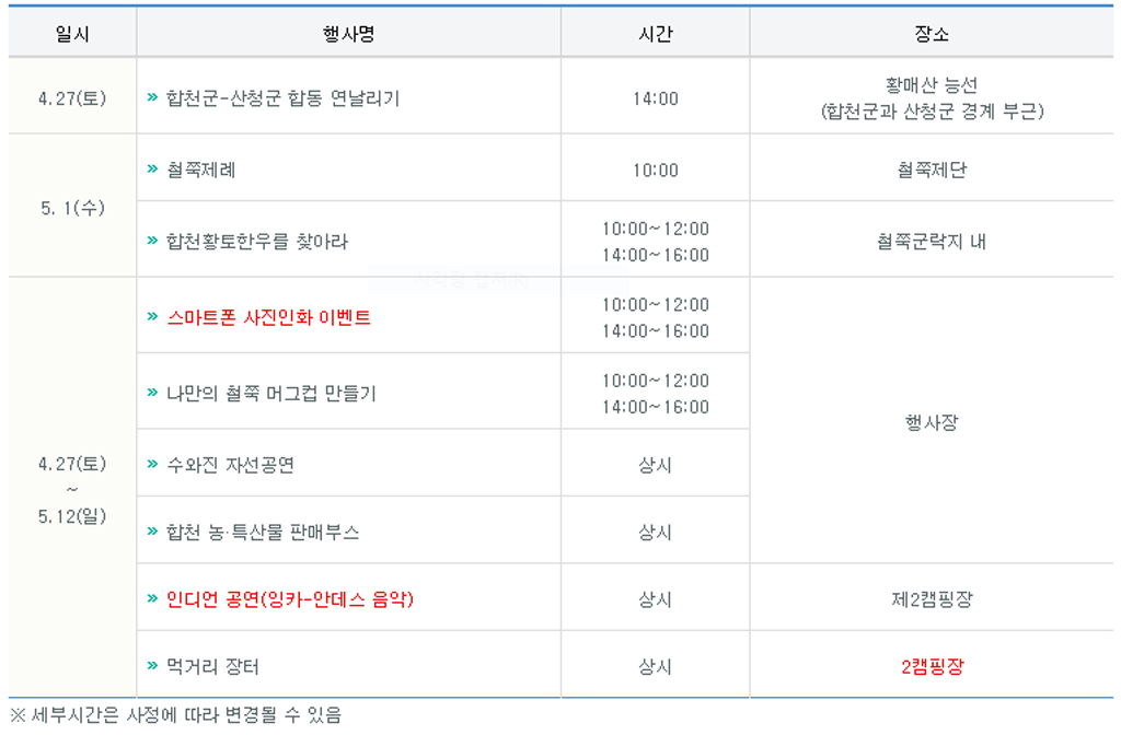 합천은 한우가 유명하죠~그래서 황토 한우 관련 부대 행사도 준비된다고 하니 가서 시식도 해보시면 좋겠네요!! 합천 한우 진짜 맛있어요.ㅋ.ㅋㅋ