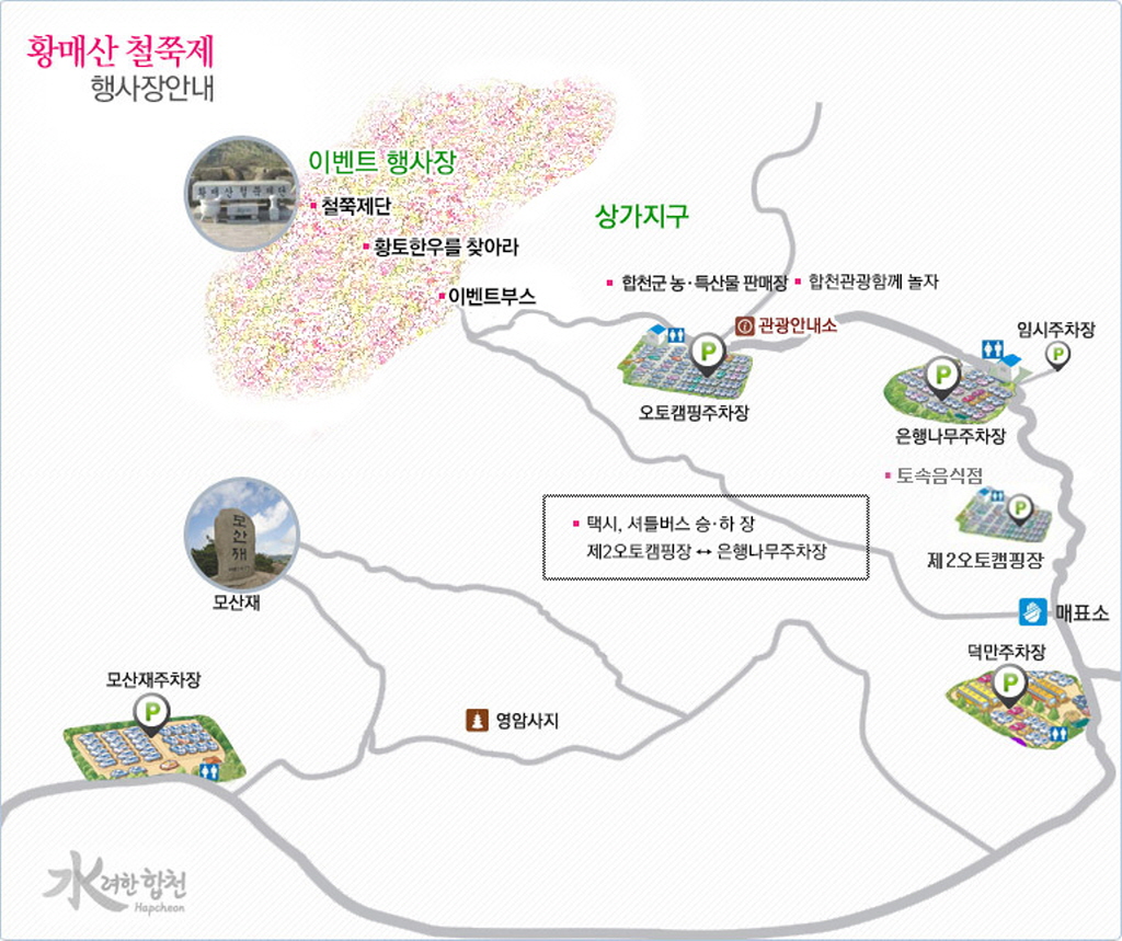 황매산에서 축제를 하다 보니 아무래도 주차가 가장 신경 쓰여요. 그래서 주최 측에서 임시 주차장을 여러 곳에서 미리 마련한 것 같아요. 등산 겸 축제를 이용하실 분들은 모산 주차장이나 덕만 주차장을 이용하시면 좋아요^^