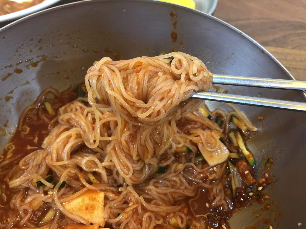 얇은 면과 시원한 국물, 오이 고명과 절인 무까지 말이 필요없쥬!!
