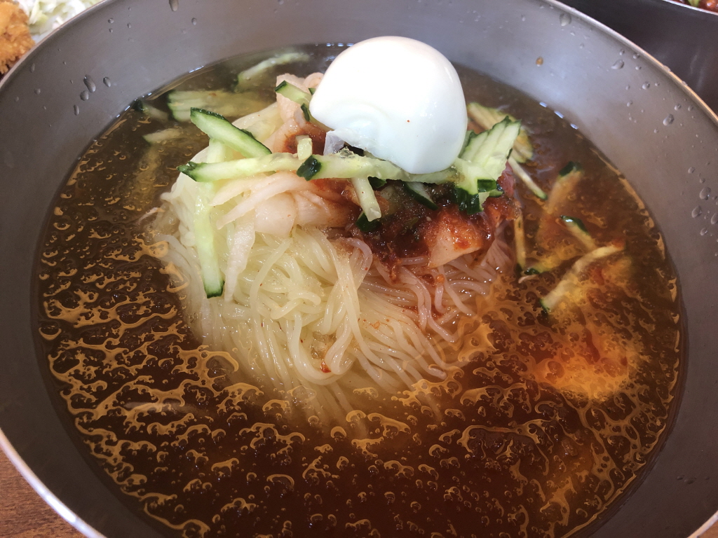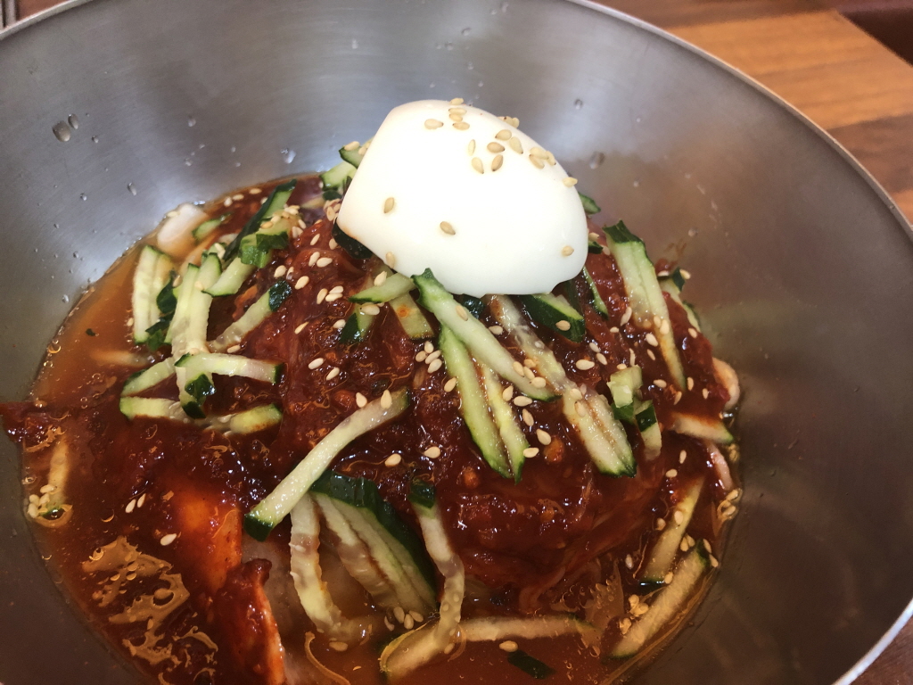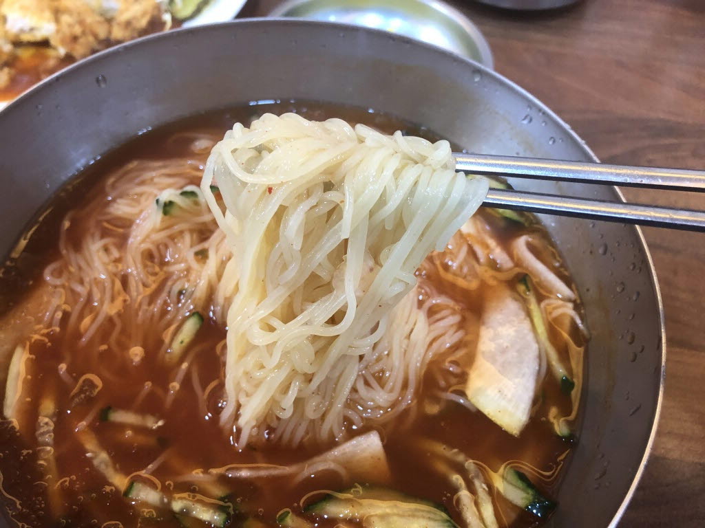 얇은 면빨과 살얼음이 보이시나요?! 테이블 오자마자 시원한 국물부터 들이켰어요!! 제가 먹어본 밀면들은 거의 다 한약재 냄새가 났거든요. 한약재 향? 그 맛을 좋아하시는 분들도 많겠지만 전 싫었는데, 여긴 그런 냄새가 하나도 안 나고 너무 시원해서 정말 좋았어요^^
