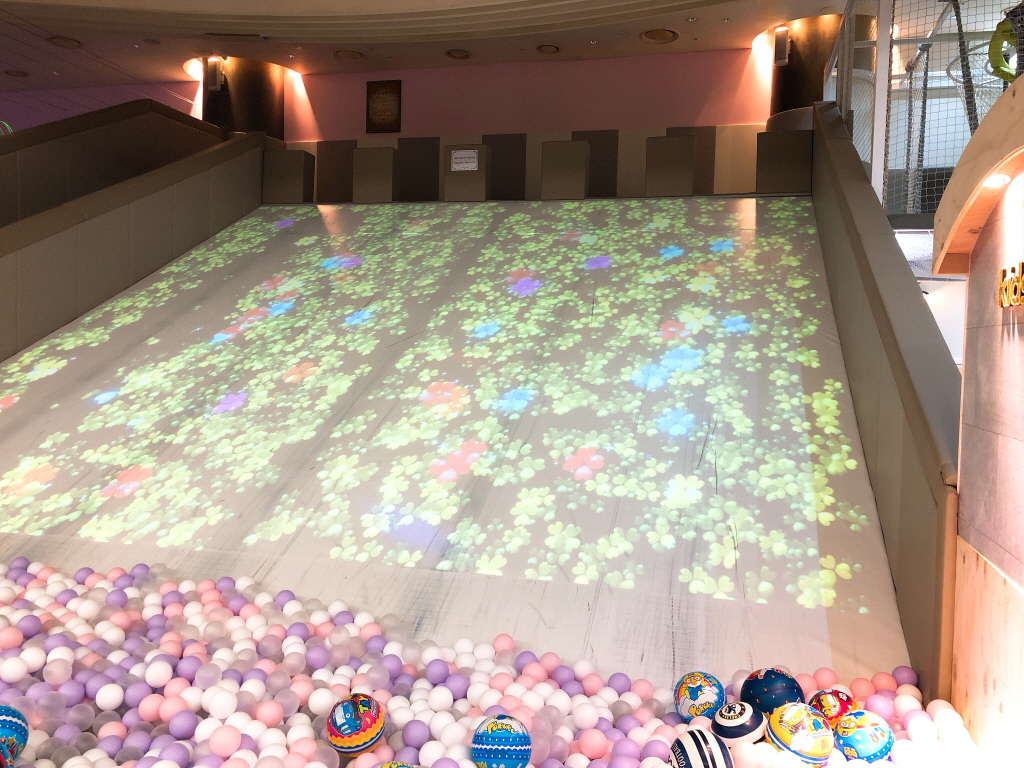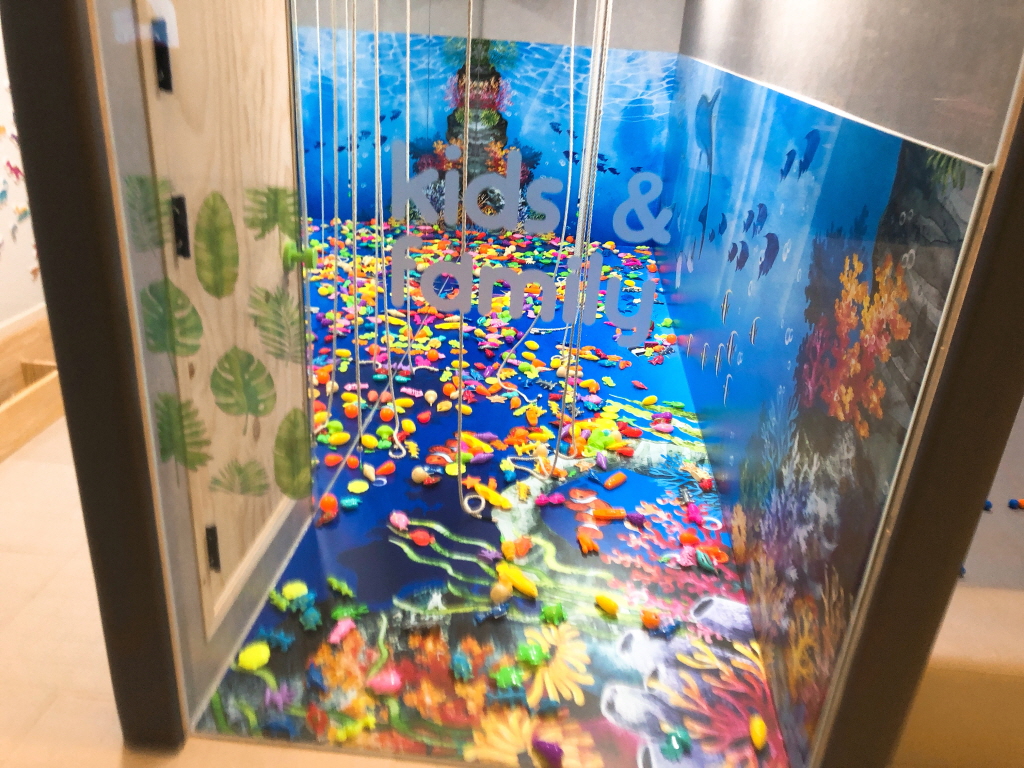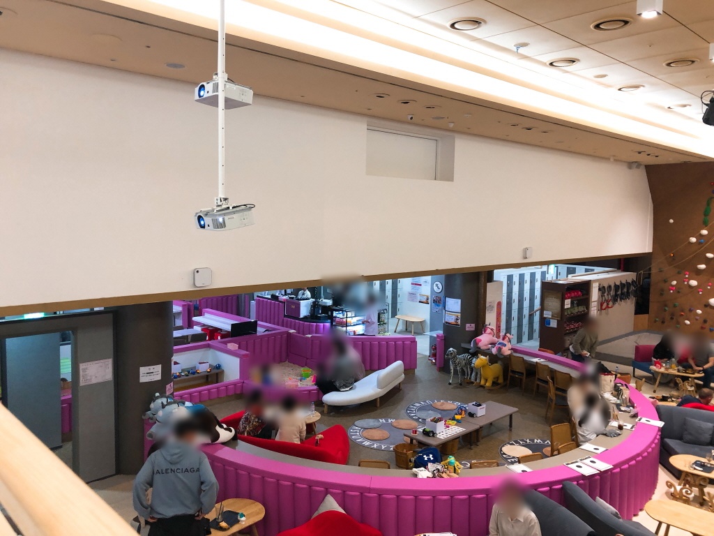낚시 놀이를 할 수 있는 2층에서 본 광경이에요!! 아이들은 놀고 어른들은 의자나 테이블에 앉아 지켜볼 수 있어요.